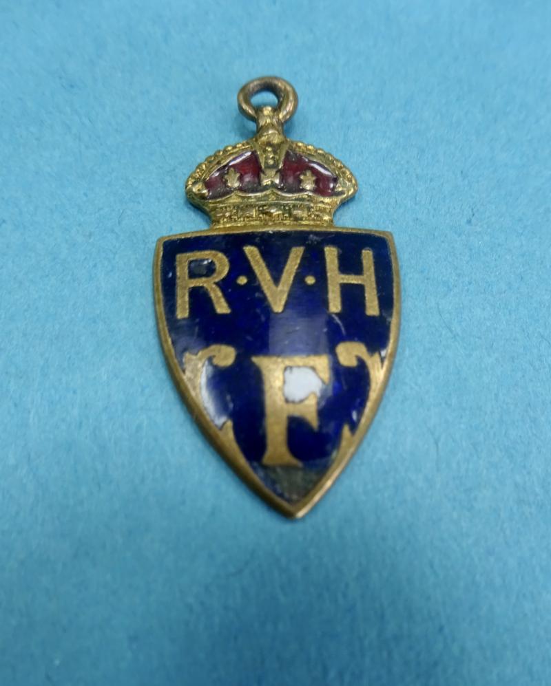 A scarce early nurses badge for the Royal Victoria Hospital Folkestone.The small pendant badge was originally suspended from a brass safety pin type fixing but this is missing It takes the form of a blue enamelled shield with a crown, bearing RVHF .Named to the rear for Nurse JEB Crick 1927-1930. This appears to be Jessie Emmeline Back Crick, who is recorded in the Members roll of the College of Nursing as having qualified from the RVH in 1930.